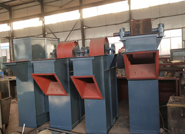 TD型斗式提升機的牽引件為橡膠帶,料斗以一定的間隔固定在橡膠帶上,橡膠帶分別繞過提升機頭部和底部的滾筒,構(gòu)成具有上升有載分支和下降無載分支的閉合環(huán)形系統(tǒng);工作時,布置在提升機頭部的驅(qū)動裝置通過頭部滾筒將動力傳給橡膠帶和料斗,物料從提升機底部的進料口進入料斗,料斗將物料提升至頭部的卸料口,在離心力和重力的共同作用下,料斗中的物料經(jīng)卸料口卸出。